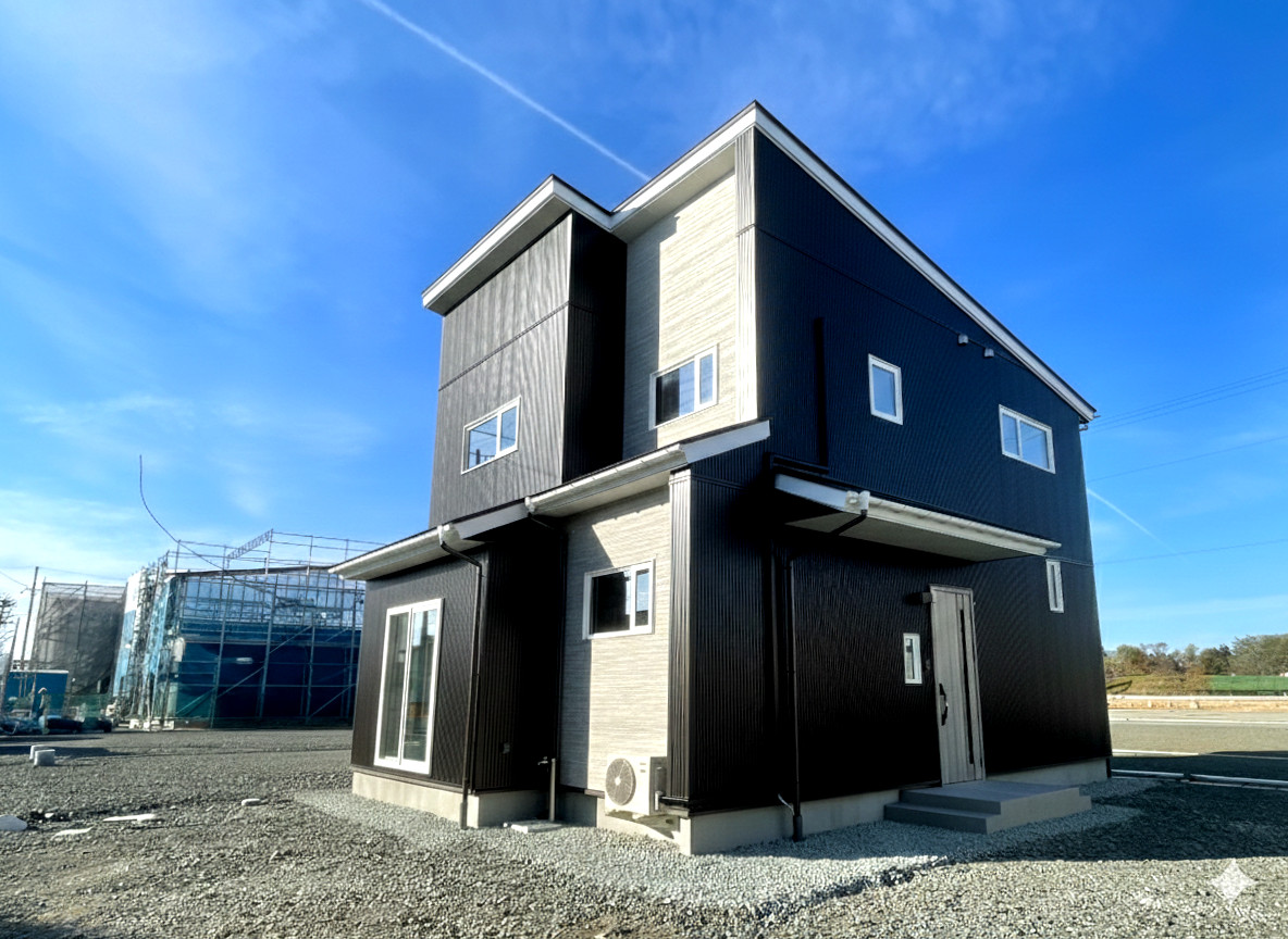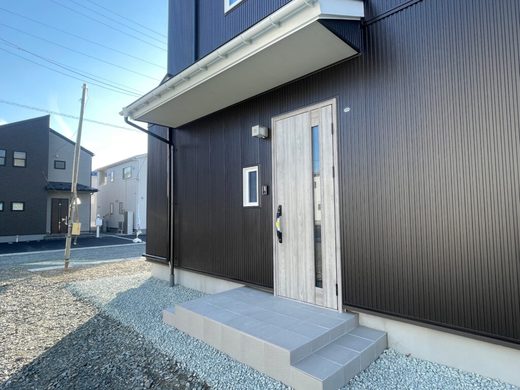 ブラックのガルバリウム鋼板にグレイストーンを組み合わせたツートン外観と、